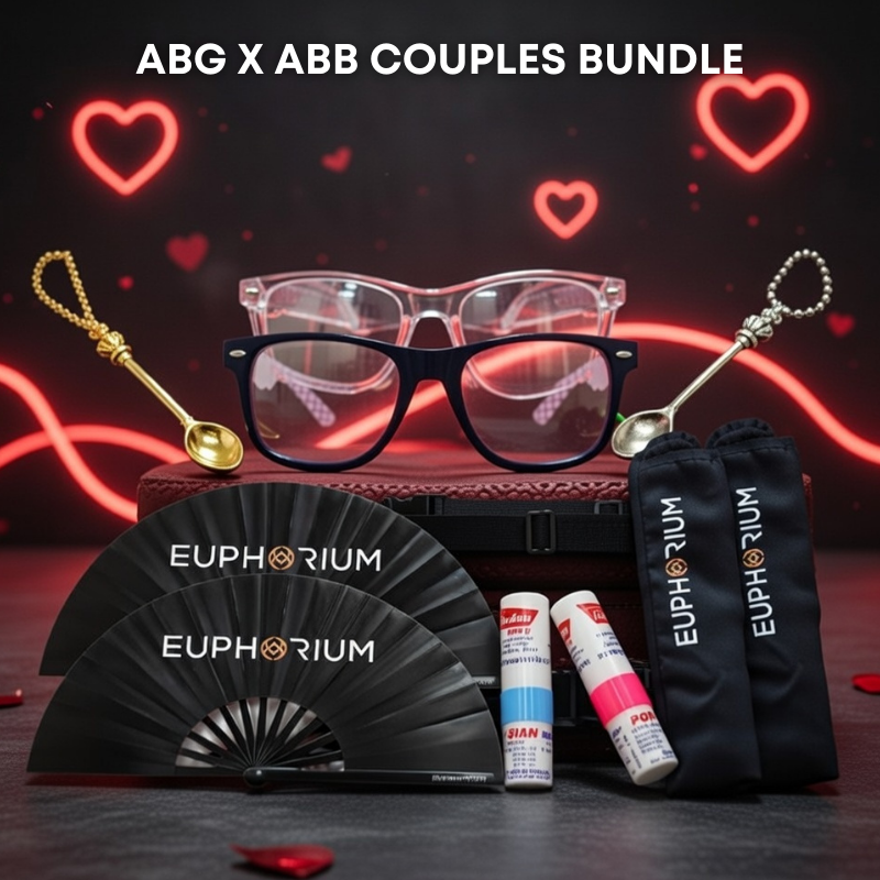 Celebrate Valentine’s Day the rave way with the ultimate ABG x ABB Couples Bundle, made for partners who dance together under the lasers. This limited-edition set includes Two Heart Diffraction Glasses to turn every light into a dreamy love-filled spectacle, plus Two Mini Spoon Necklaces for matching couple energy and iconic festival style ✨😎