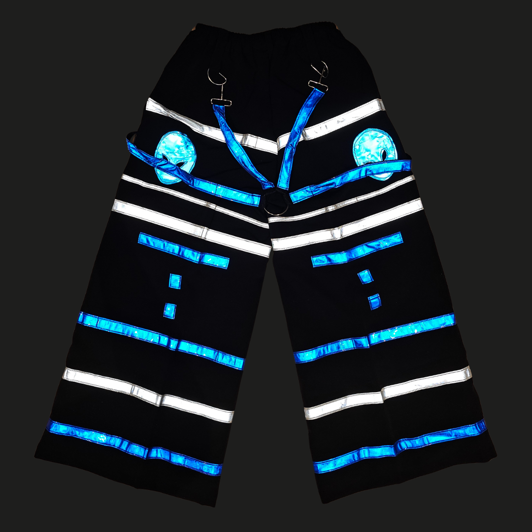 With the explosive resurgence of the Melbourne Shuffle, we had to bring Phat Pants back - reborn from the heart of Aussie rave history. Featuring exaggerated flares, vibrant reflective panels and bold suspenders - these are the iconic shuffle pants you've seen in every Melbourne Shuffle compilation. Every kick, spin, and slide becomes a visual assault, amplified under lasers and strobes. Join the revolution, embrace the nostalgia and own the dancefloor at your next rave or festival.
