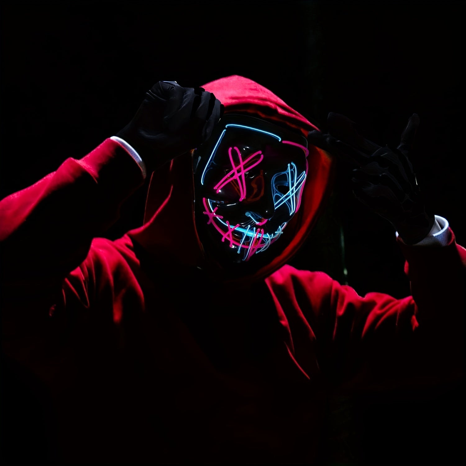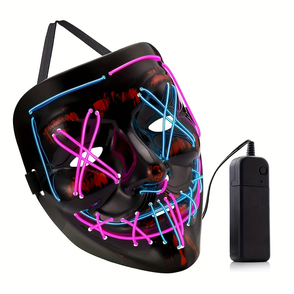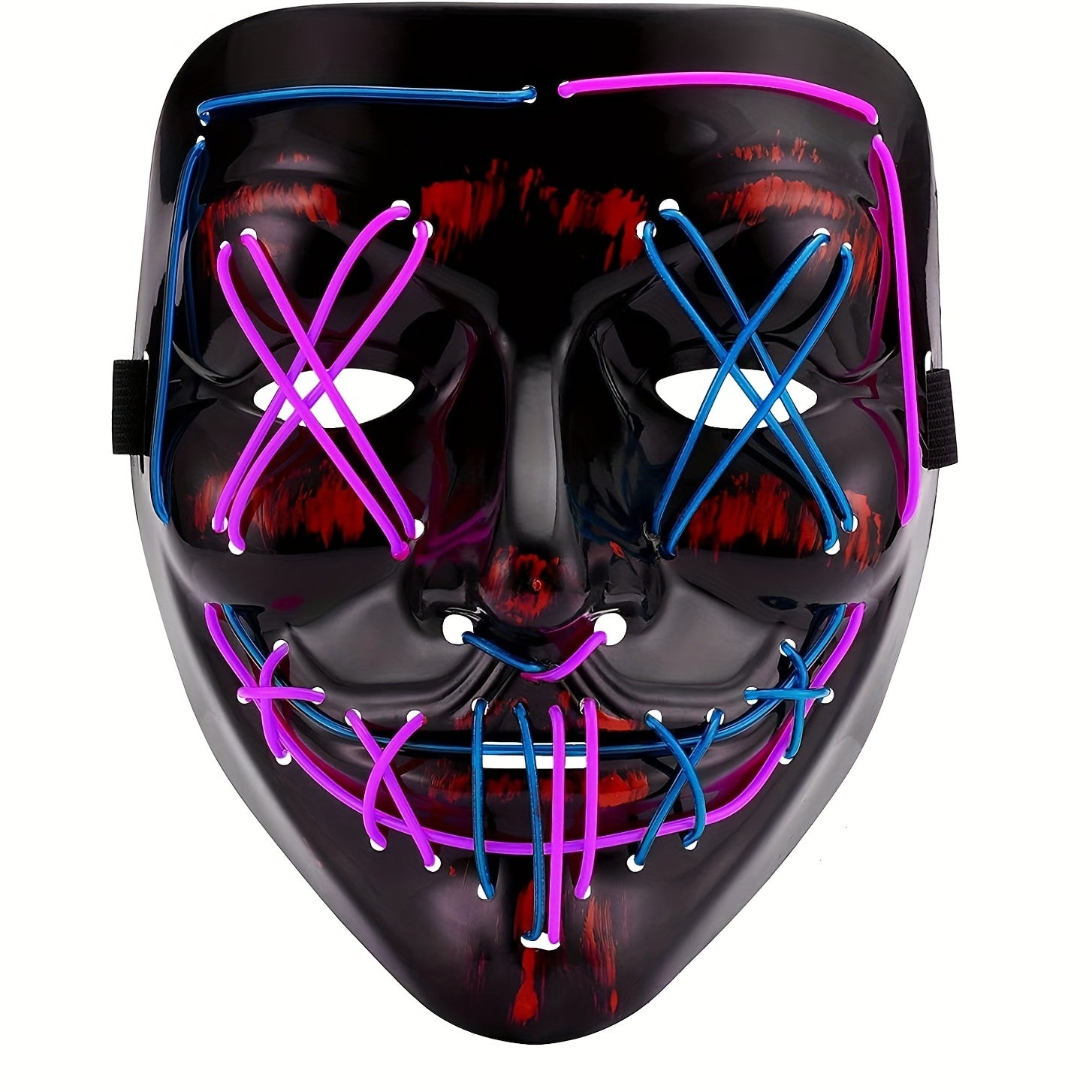 Step into a neon dystopia with our LED Purge Mask. Featuring glowing stitched eyes and a sinister grin, this mask is designed for the defiant and radiates unhinged energy. Command attention and leave an unforgettable impression at your next rave or festival.