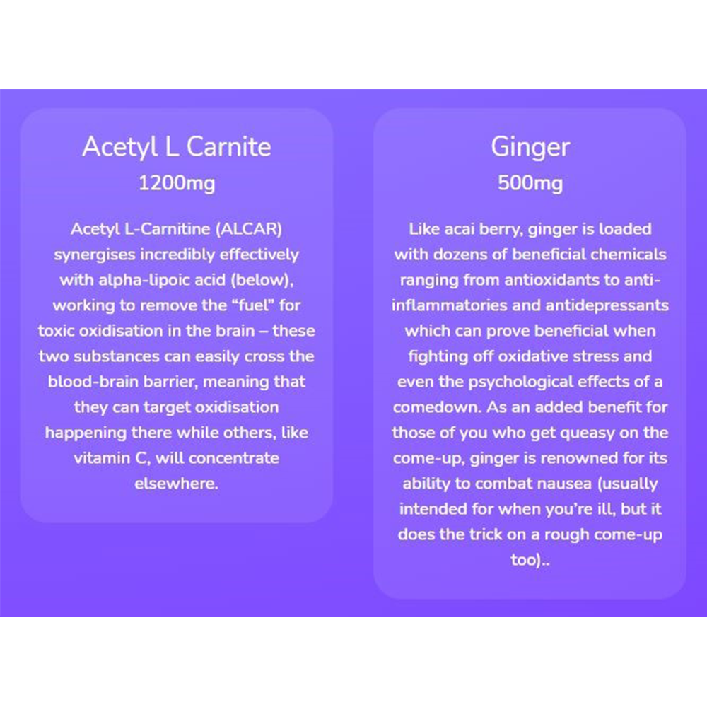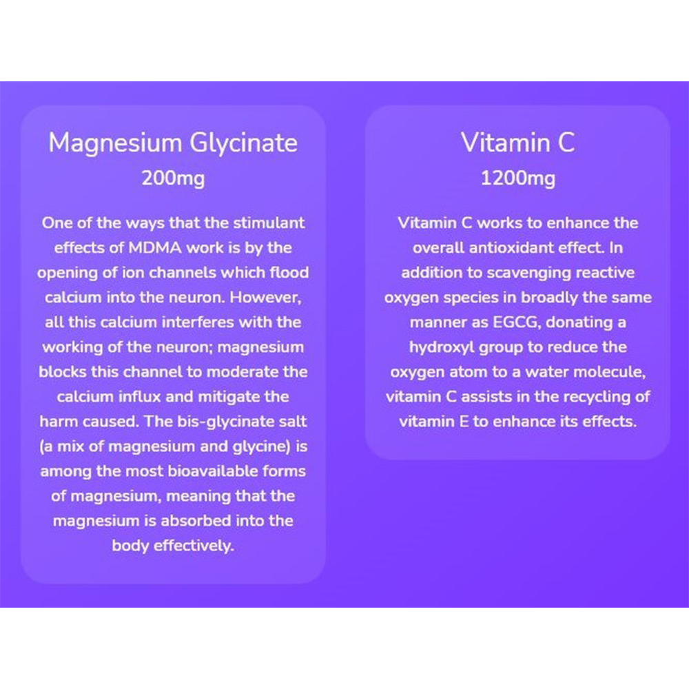 Long nights and elevated states come at a cost—but with RaverRX, you don’t have to pay the full price. Formulated specifically for ravers, this supplement is your go-to recovery ally—designed to support your body and brain before, during, and after the party. Packed with science backed neuroprotective ingredients, antioxidants, and key vitamins, RaverRX helps support energy levels, reduce oxidative stress, and ease the dreaded comedown to foster a restorative sleep.