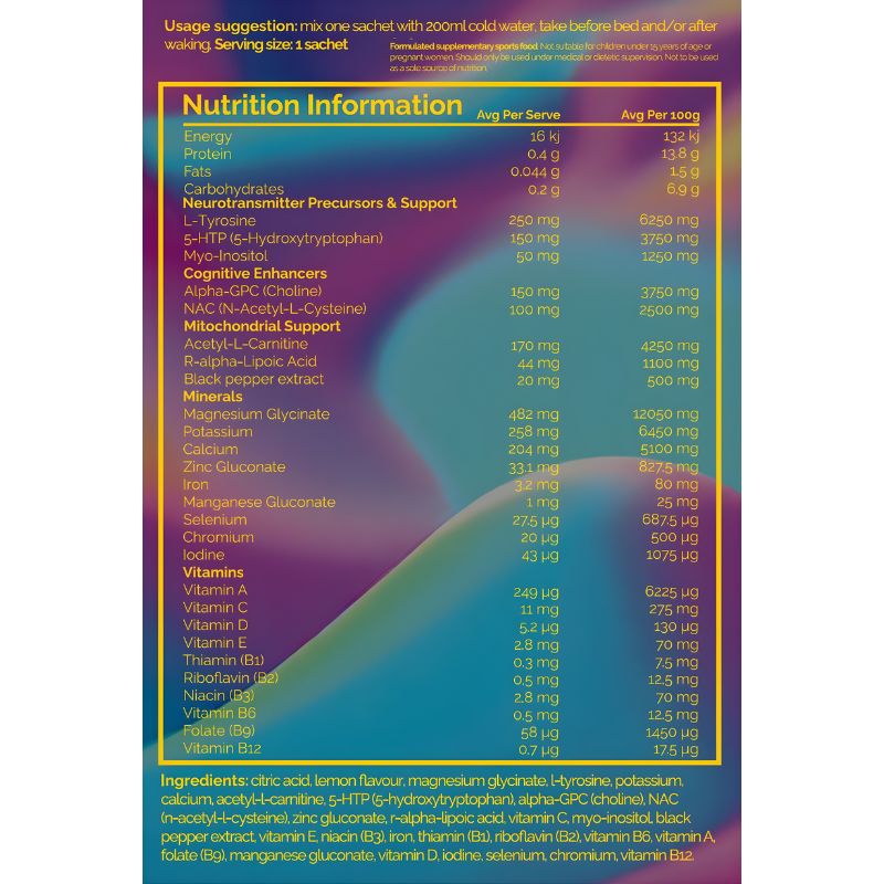 Packed with 27 potent ingredients like 5-HTP, L-Tyrosine, magnesium, antioxidants, and vitamins - it targets brain fog, anxiety, low mood and fatigue so you bounce back feeling sharp, positive and full of energy the next day.